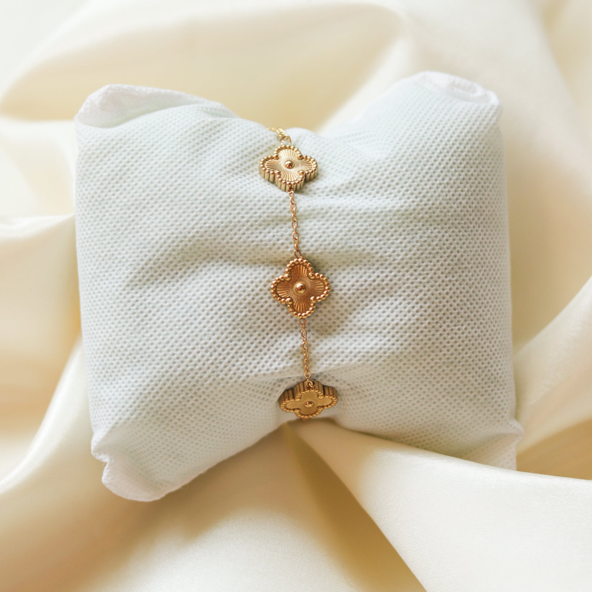 Embrace timeless elegance with the Silver Clover Charm Bracelet, inspired by the classic Van Cleef & Arpels Alhambra design. This bracelet features six delicate Gold clover charms, each adorned with a shimmering white center, symbolizing luck and sophistication. Luzura — Artificial Stainless Steel Jewellery E‑commerce in Pakistan. Hypoallergenic, tarnish‑resistant, long‑lasting shine. Return policy: only damaged or incorrect items with customer-provided unboxing videos are accepted.