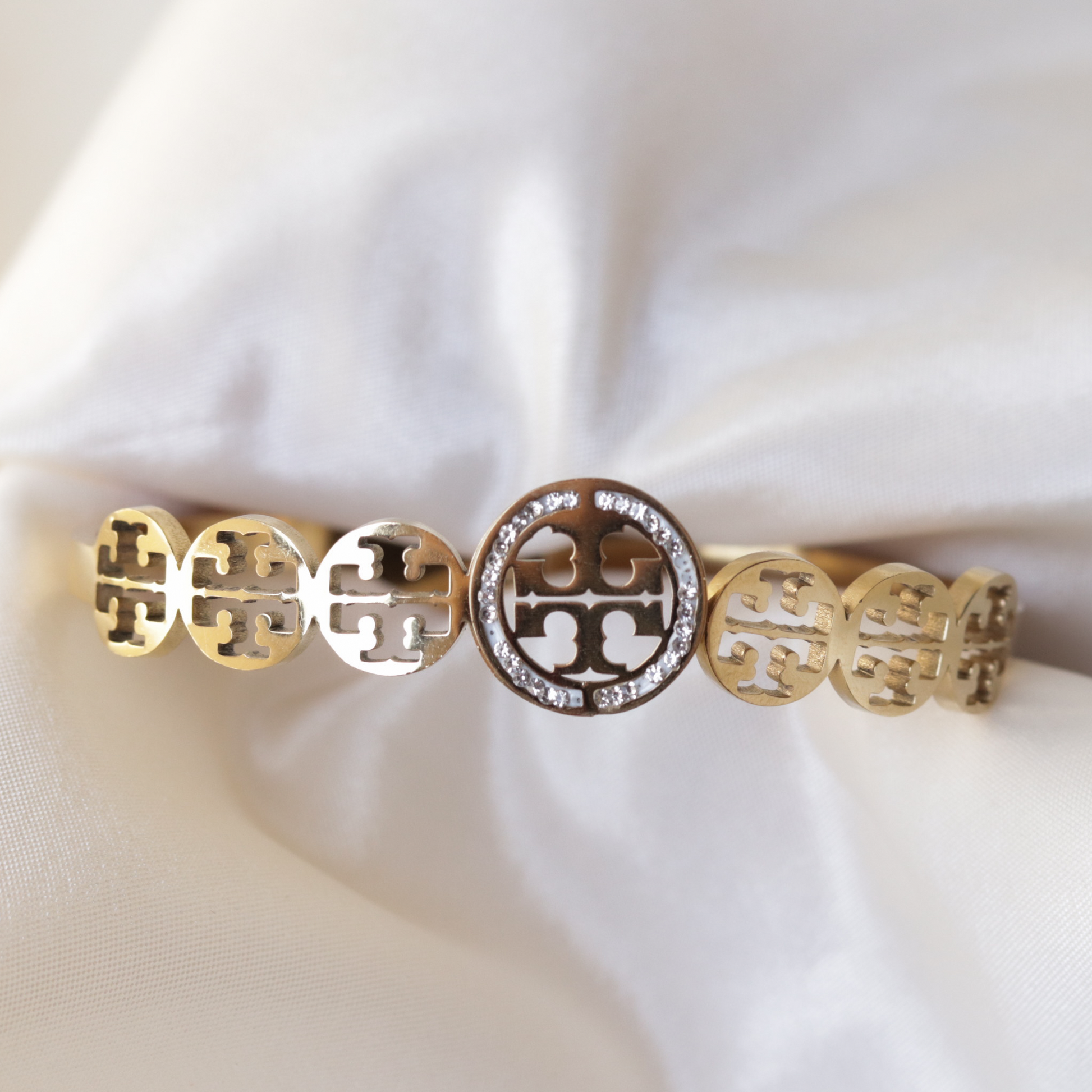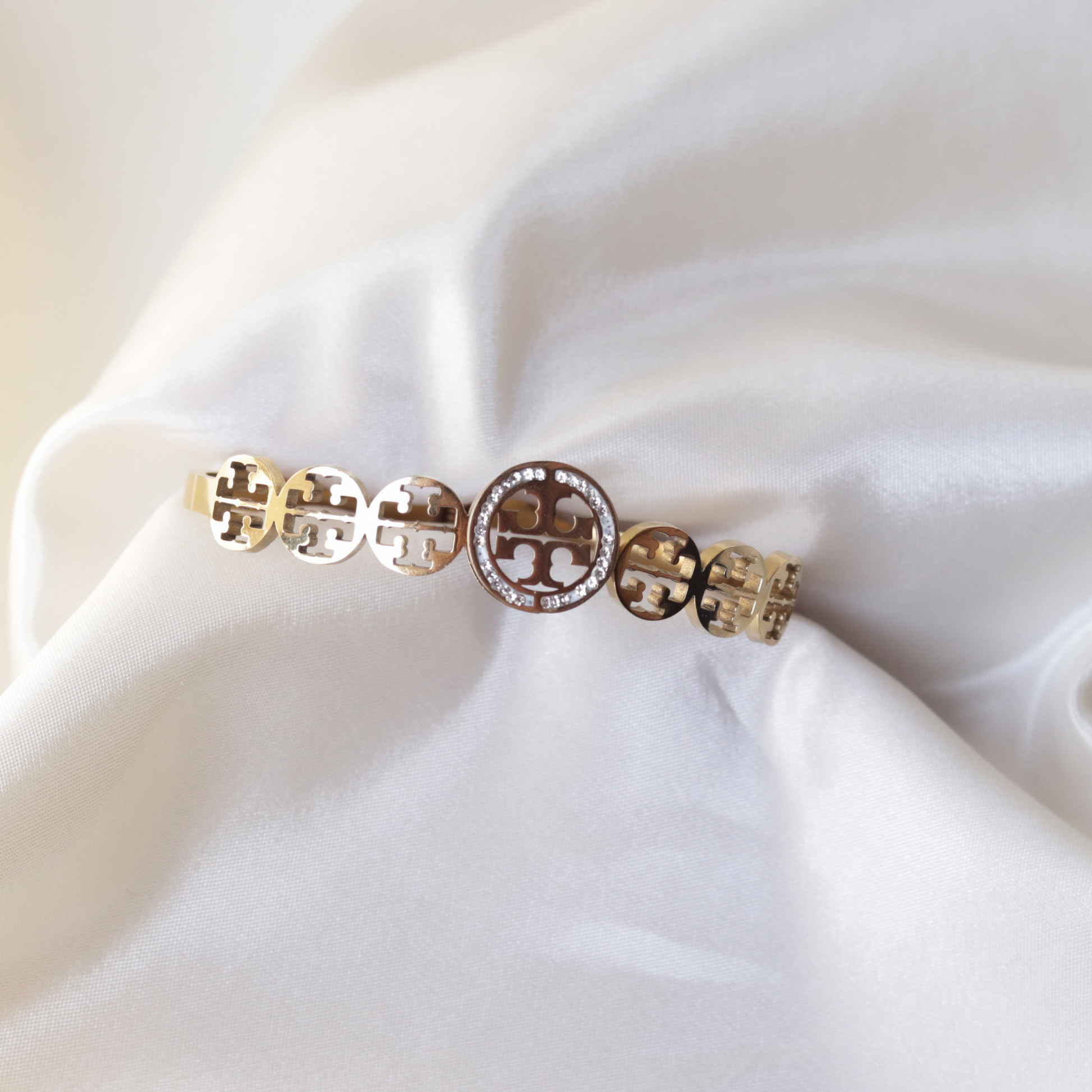 Elevate your style with the Regal Crest Cuff, a sophisticated bracelet inspired by the iconic Tory Burch emblem. Crafted with precision, this gold-toned piece features a series of signature cut-out logos, accented with a dazzling crystal-studded centerpiece. Its sleek and timeless design makes it a versatile accessory, perfect for both casual elegance and formal glamour. Add a touch of luxury to your jewelry collection with this statement cuff. Luzura — Artificial Stainless Steel Jewellery E‑commerce in Pakistan. Hypoallergenic, tarnish‑resistant, long‑lasting shine. Return policy: only damaged or incorrect items with customer-provided unboxing videos are accepted.